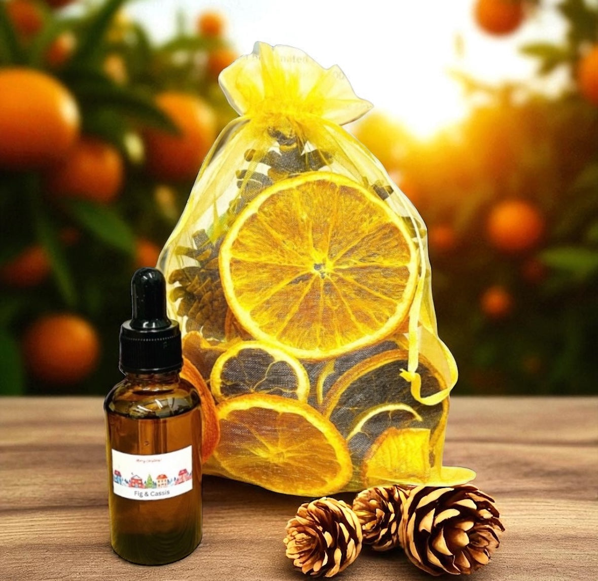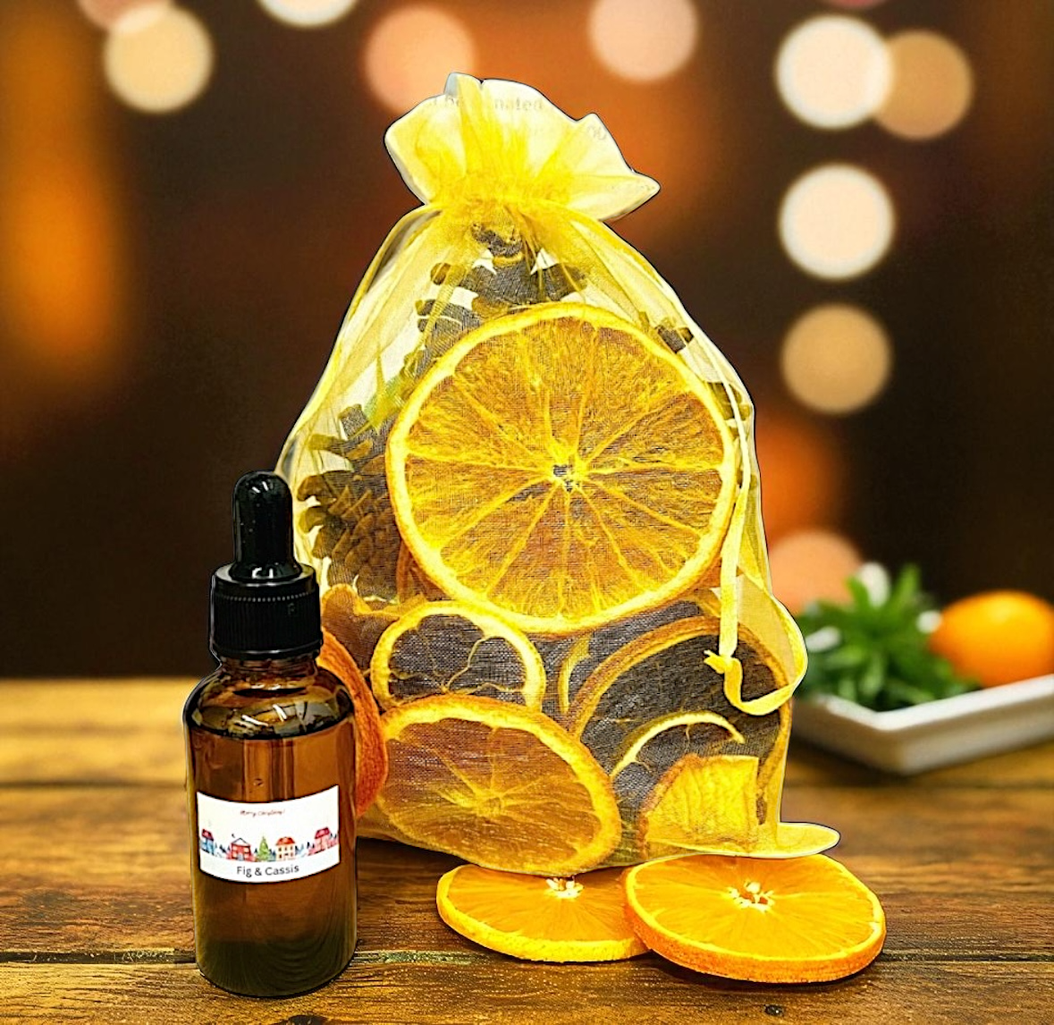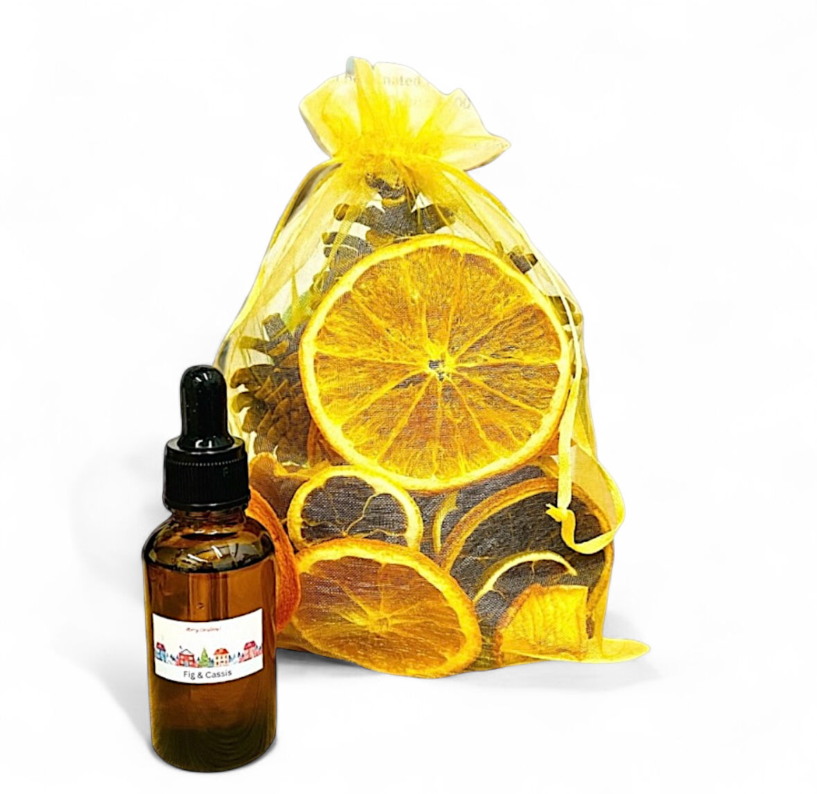 A perfect Pot Pourri combination of dried seasonal fruits such as zesty Oranges, and citrusy Lemons, and Limes, complemented by seasonal spices such as Cloves, and Cinnamon Sticks, and nestled in a pretty gold or silver organza drawstring bag. Included is a bottle of seasonal fragrance. Simply place the fruits into an appropriate dish and use the dropper bottle to scent your Pot Pourri, adding as little or as much as you need to fragrance your space.